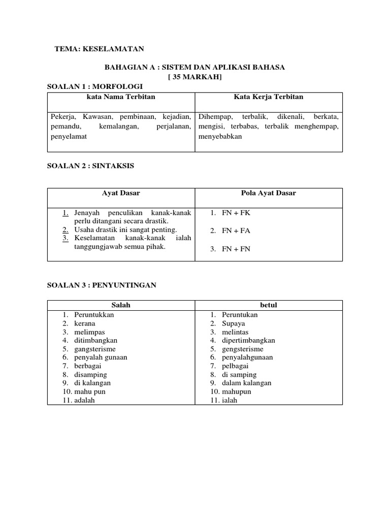 Tema Keselamatan Bahagian A Sistem Dan Aplikasi Bahasa 35 Markah Soalan 1 Morfologi Kata Nama Terbitan Kata Kerja Terbitan Pdf